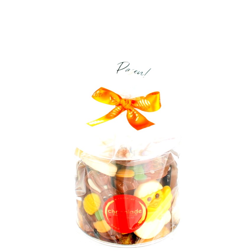 Een koker gevuld met 375 gram gemengde paaschocolade. Als je op zoek bent naar een paasgeschenk met een vrolijke uitstraling en toch een flinke portie paaschocolaatjes, dan is dit een uitstekende mogelijkheid.