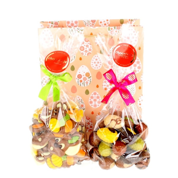 Een vrolijk geschenktasje gevuld met twee voordeelzakken. Eén zak paasfiguurtjes (325 gram) en een zak luxe paaseitjes (375 gram); kortom 750 gram heerlijk luxe paaschocolade. Een leuk cadeau voor fijne paasdagen!