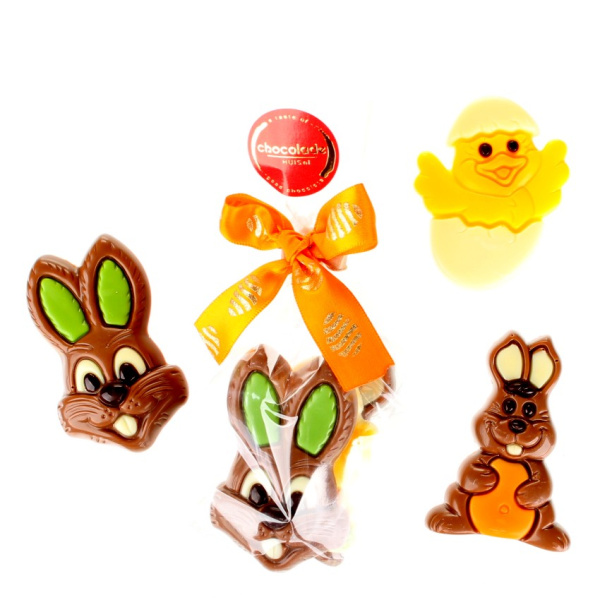 Een klein zakje gevuld met een mix van 3 vrolijke paasfiguurtjes. Het zakje weeg ca.50 gram en wordt verpakt met een strikje. Een leuke weggever voor een klein budget.
